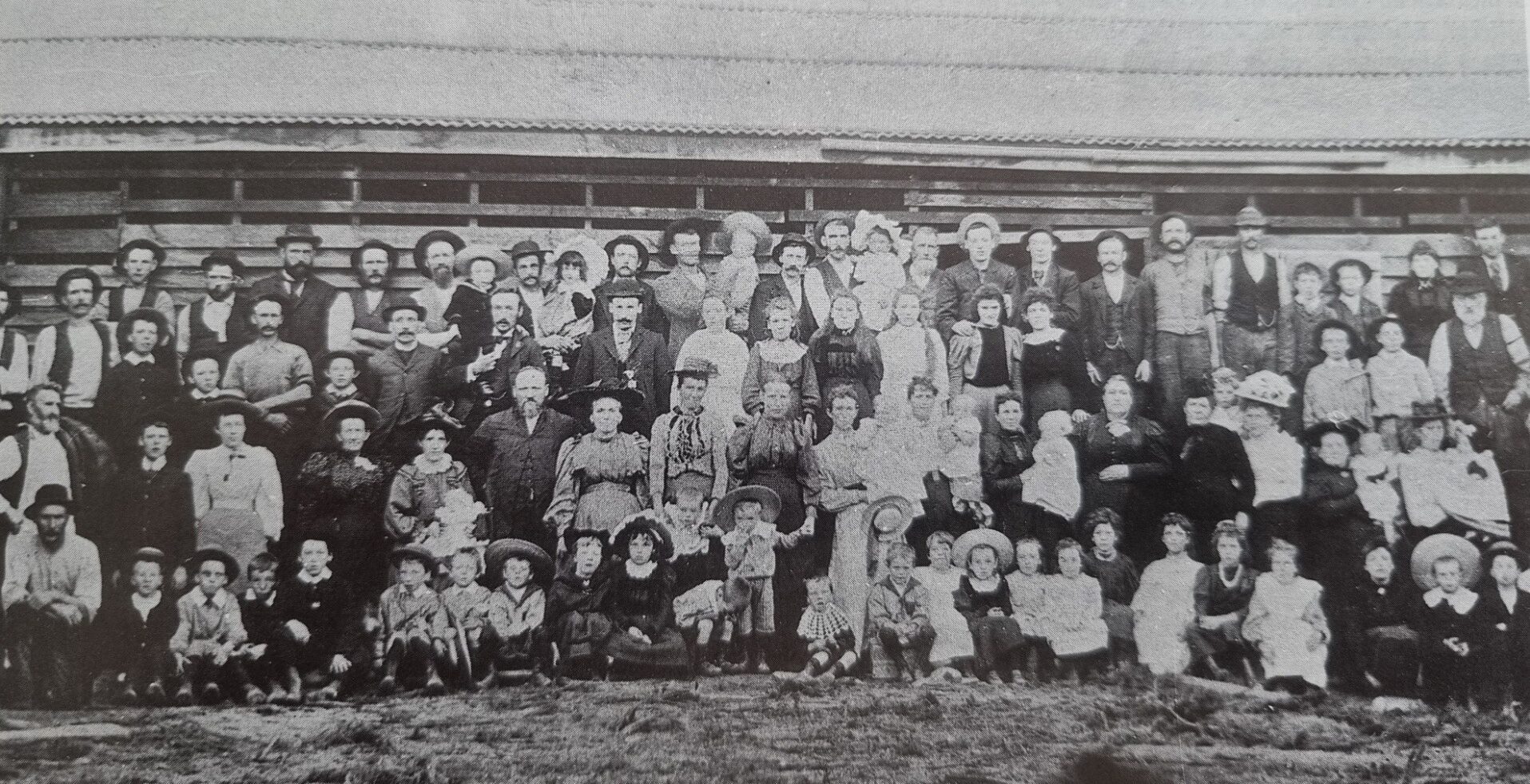 Residents of the Ryson’s Creek mill around the turn of the century. W.H. Collins and his wife are centre of the front row. Photo courtesy C McDermid Collection