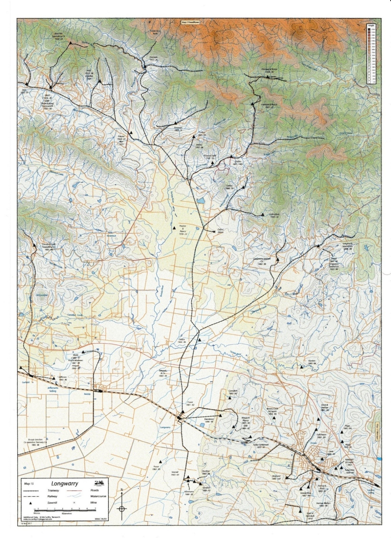 Harry Collins purchased the Gipsy Creek mill from Mary Fraser, and Alexander Mackay, and moved it to the Robinson Creek site, 14 klm North of Longwarry. A tramway was to be built to service the mill and was begun in 1889. However, Daylesford sawmiller Thomas Orde had holdings 10 klm north of Longwarry in the path of the planned tramway and refused access to Collins to lay his line until correct easement permits had been granted. Collins was forced to transport his goods via road until 1891 when the easement had been granted.